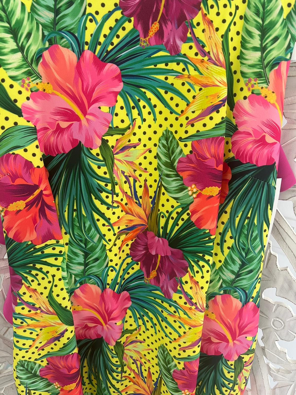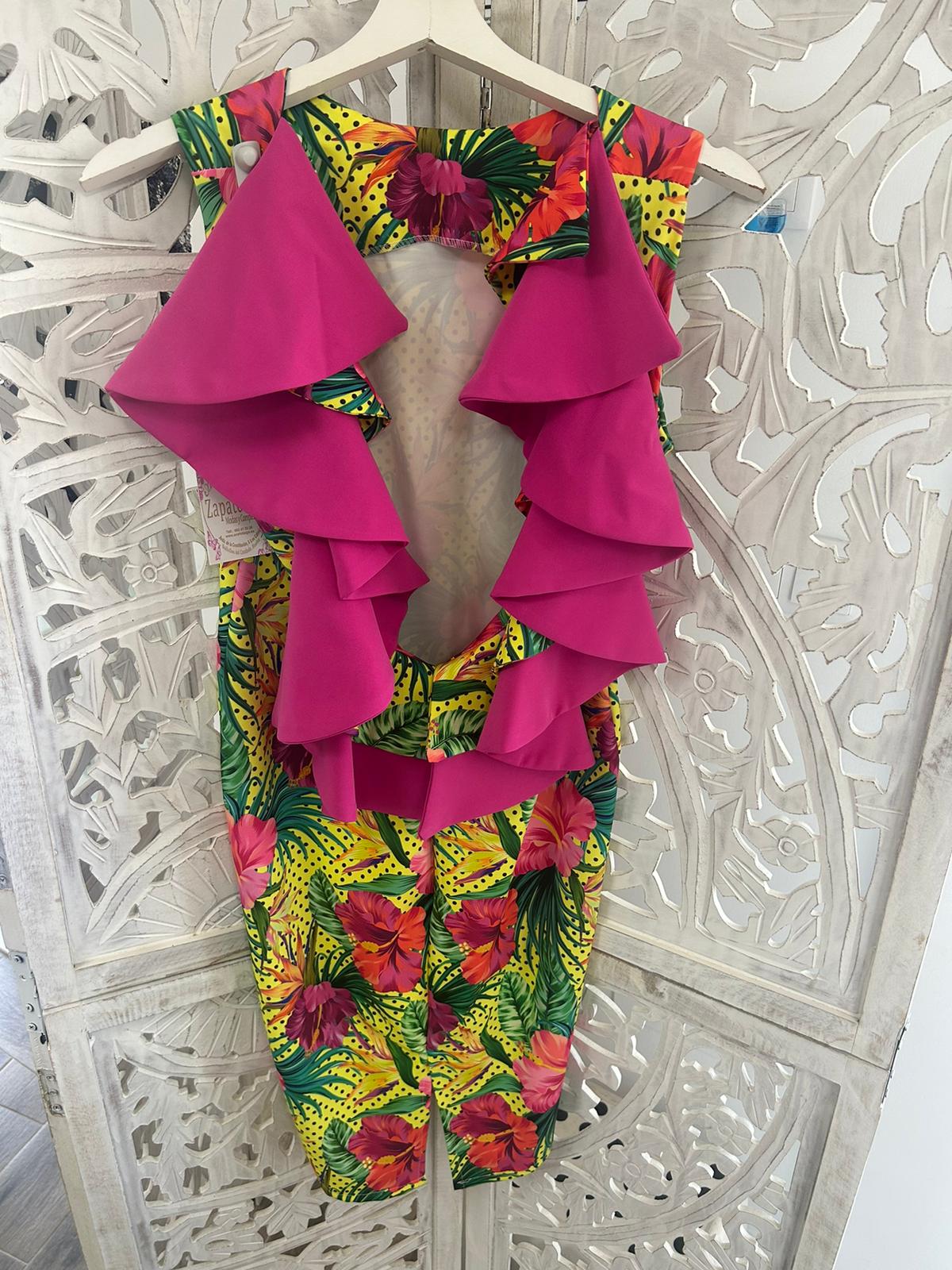 VESTIDO ESTAMPADO CON ESCOTE Y VOLANTES FUCSIAS EN LA ESPALDA