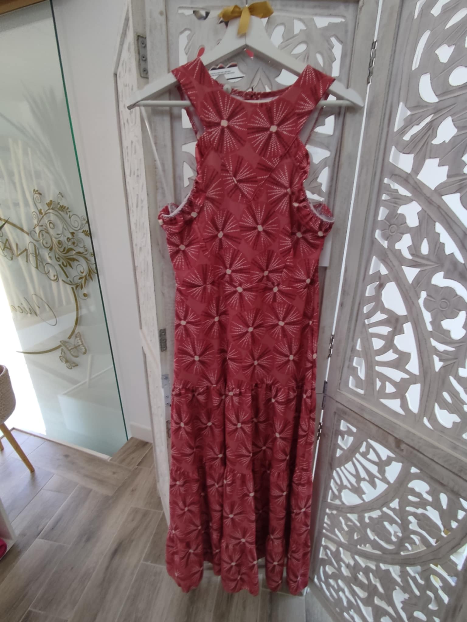 VESTIDO LARGO TIPO CANASTERO EN COLOR ROJO CORAL.