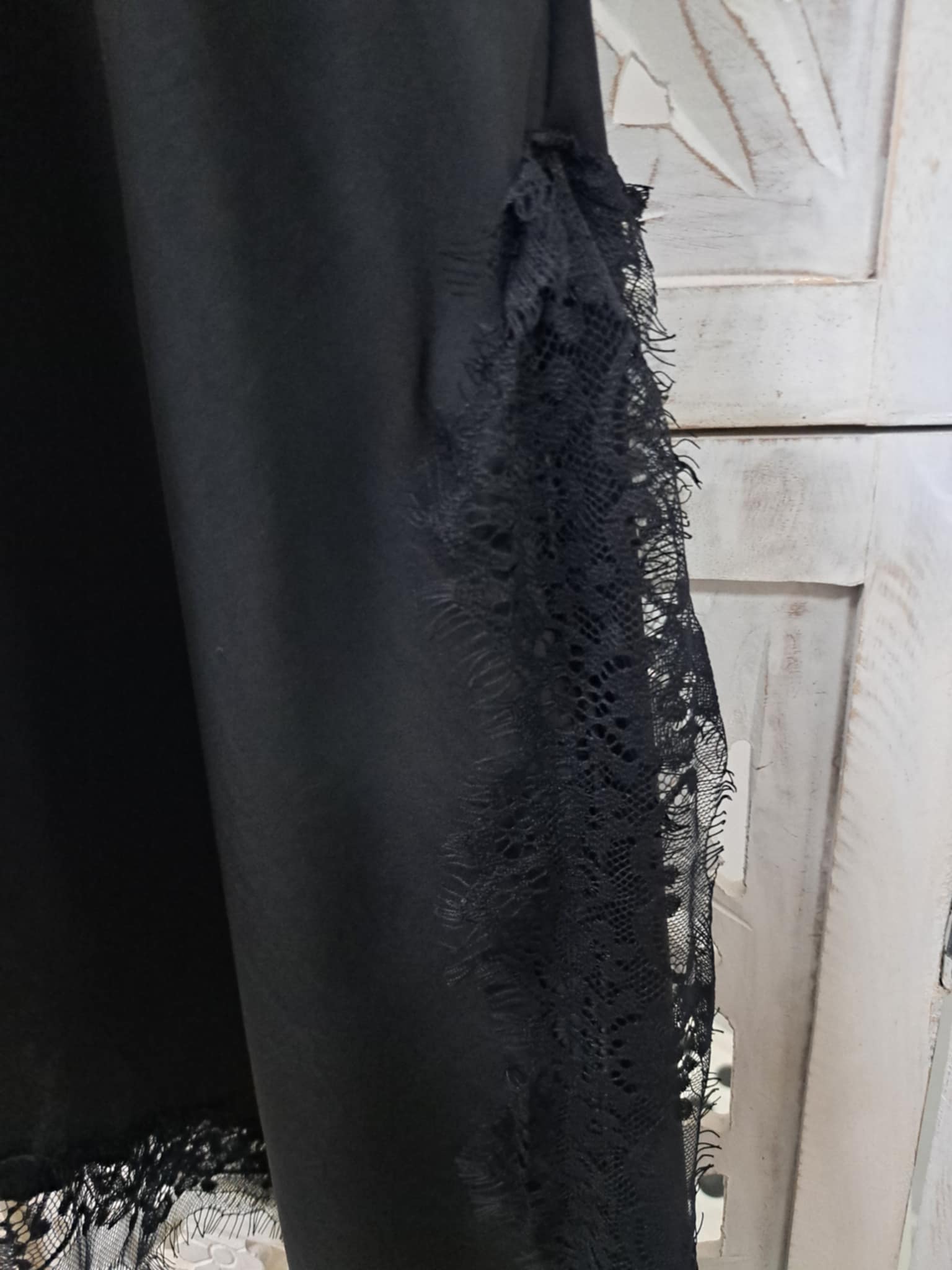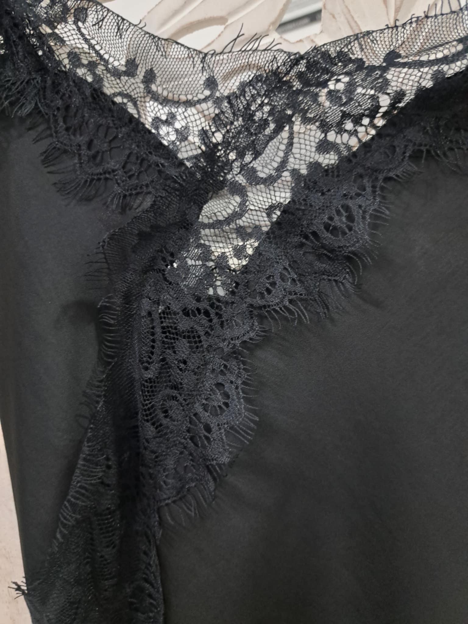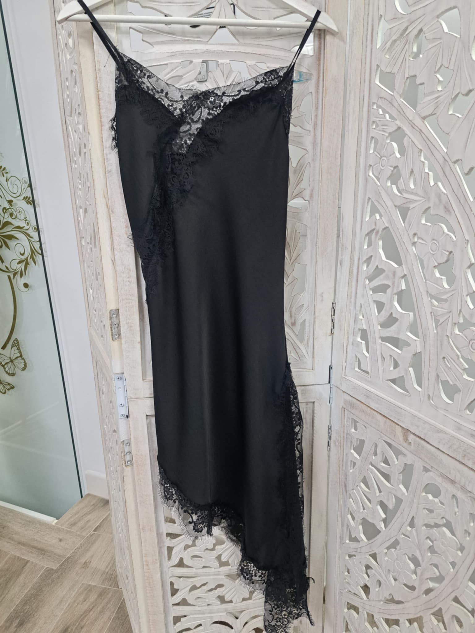 TIRANTES FINOS, ESCOTE Y BAJO ASIMÉTRICO ADORNADO CON ENCAJE.