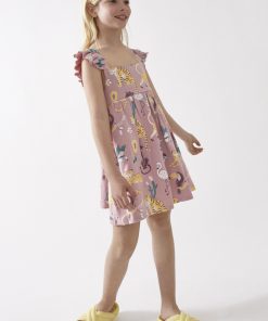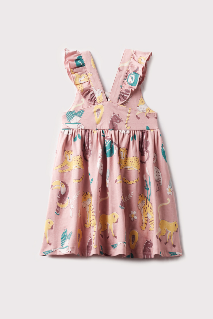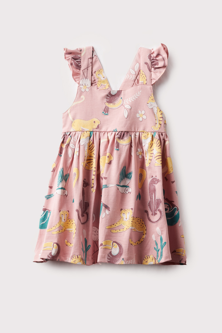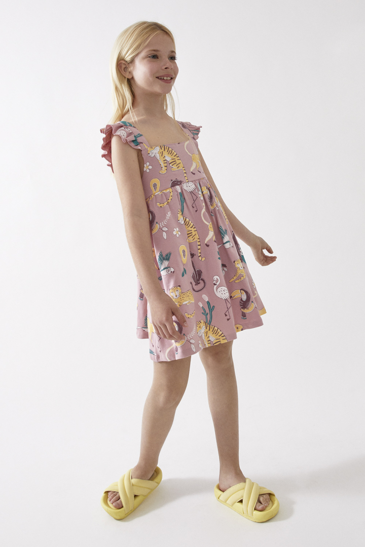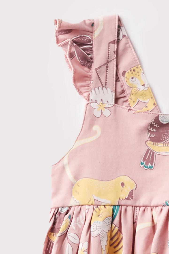 Estampado de tucán , león sobre fondo rosa. Volantes en las tirantas.