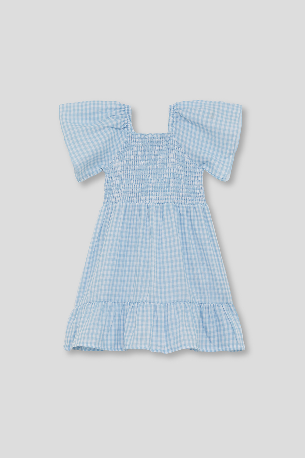Precioso modelo de vestido de cuadros vichy en color celeste.
