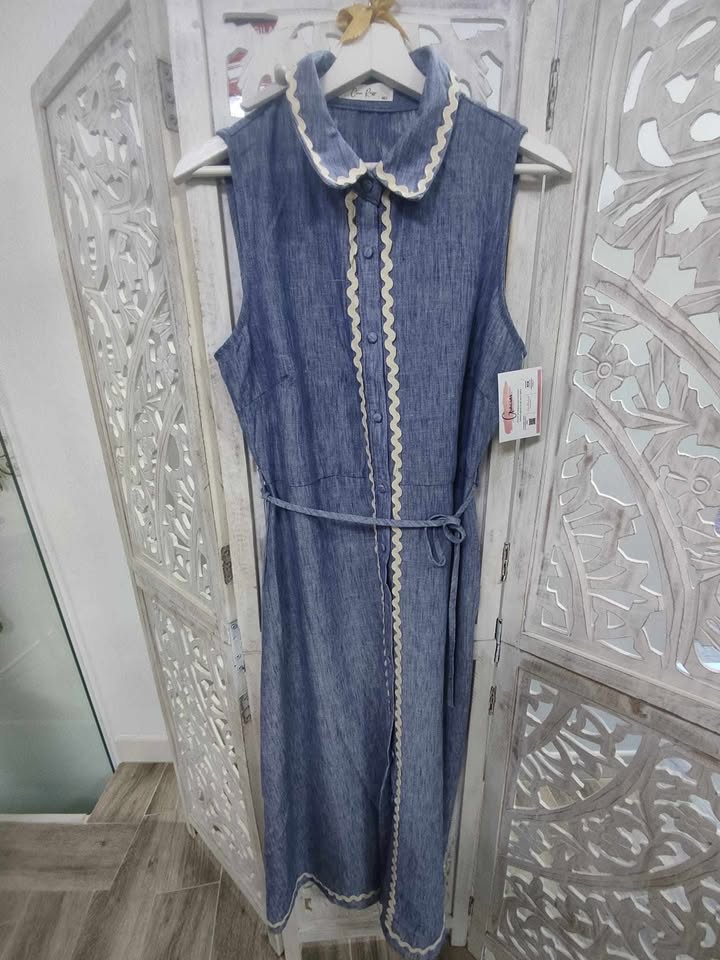 Vestido sin mangas de estilo casual confeccionado en tela tipo denim ligero, ideal para un look fresco y cómodo. Presenta un diseño recto con cierre frontal de botones y delicados detalles ondulados en contraste a lo largo de la botonadura, el cuello y el bajo, que aportan un toque femenino y distintivo. Incluye cinturón ajustable del mismo tejido para entallar la silueta. Cuello redondo con acabado decorativo. Perfecto para uso diario, salidas informales o días de verano.