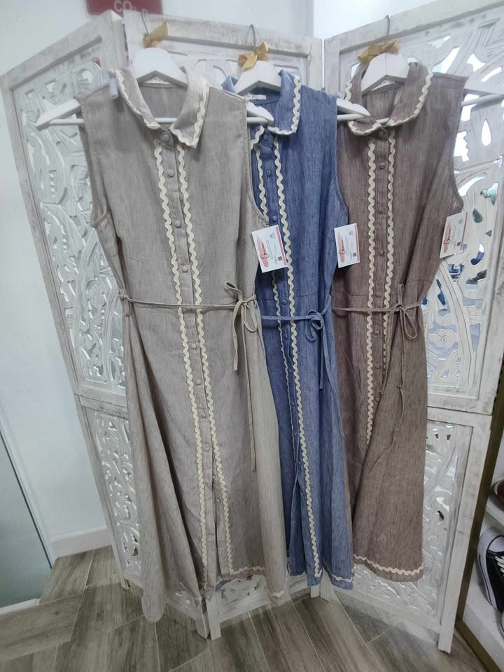 Vestido sin mangas de estilo casual confeccionado en tela igera de color marrón claro, ideal para un look fresco y cómodo. Presenta un diseño recto con cierre frontal de botones y delicados detalles ondulados en contraste a lo largo de la botonadura, el cuello y el bajo, que aportan un toque femenino y distintivo. Incluye cinturón ajustable del mismo tejido para entallar la silueta. Cuello redondo con acabado decorativo. Perfecto para uso diario, salidas informales o días de verano.